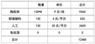 外墻陶粒磚400x200x200作為外墻,大約12.5塊一平方,需要3187.5塊,一塊大概12元,總共3187.5x12=38250元,內(nèi)墻采用600*200*100作為內(nèi)墻,大約8塊一平方,一塊大概9元,總共130x8x9=9360元(不考慮磨損),人工一平方30塊,255平7650,內(nèi)墻20塊一平方,130平2600元,砌墻人工費(fèi)共10250元,塊輔材外墻8塊一平方,總輔材2040元,內(nèi)墻4塊一平方,總共520元,總計(jì):38250+9360+7650+2600+2040+520=60420元。