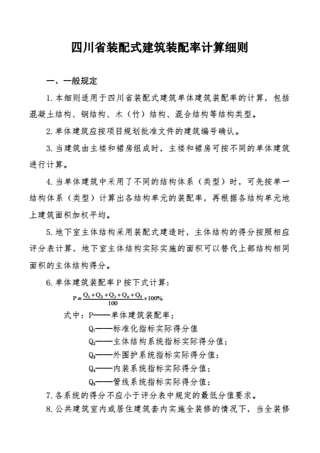 《四川省裝配式建筑裝配率計算細則(試行)》實施以來,對全省裝配式建筑裝配率計算起到了積極的指導和規范作用。為進一步推動我省裝配式建筑的發展,規范裝配率計算,提升標準化建設水平,推進系統集成技術發展應用,我廳組織相關單位進行了修訂,并經專家審查通過,形成了《四川省裝配式建筑裝配率計算細則》,現予印發,自 2020 年 10 月 1 日起實施。