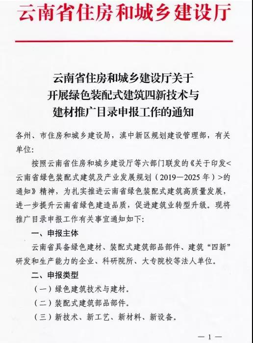 2020年3月17日,云南省住房和城鄉建設廳關于印發《開展綠色裝配式建筑四新技術與建材推廣目錄申報工作》的通知,內容強調: